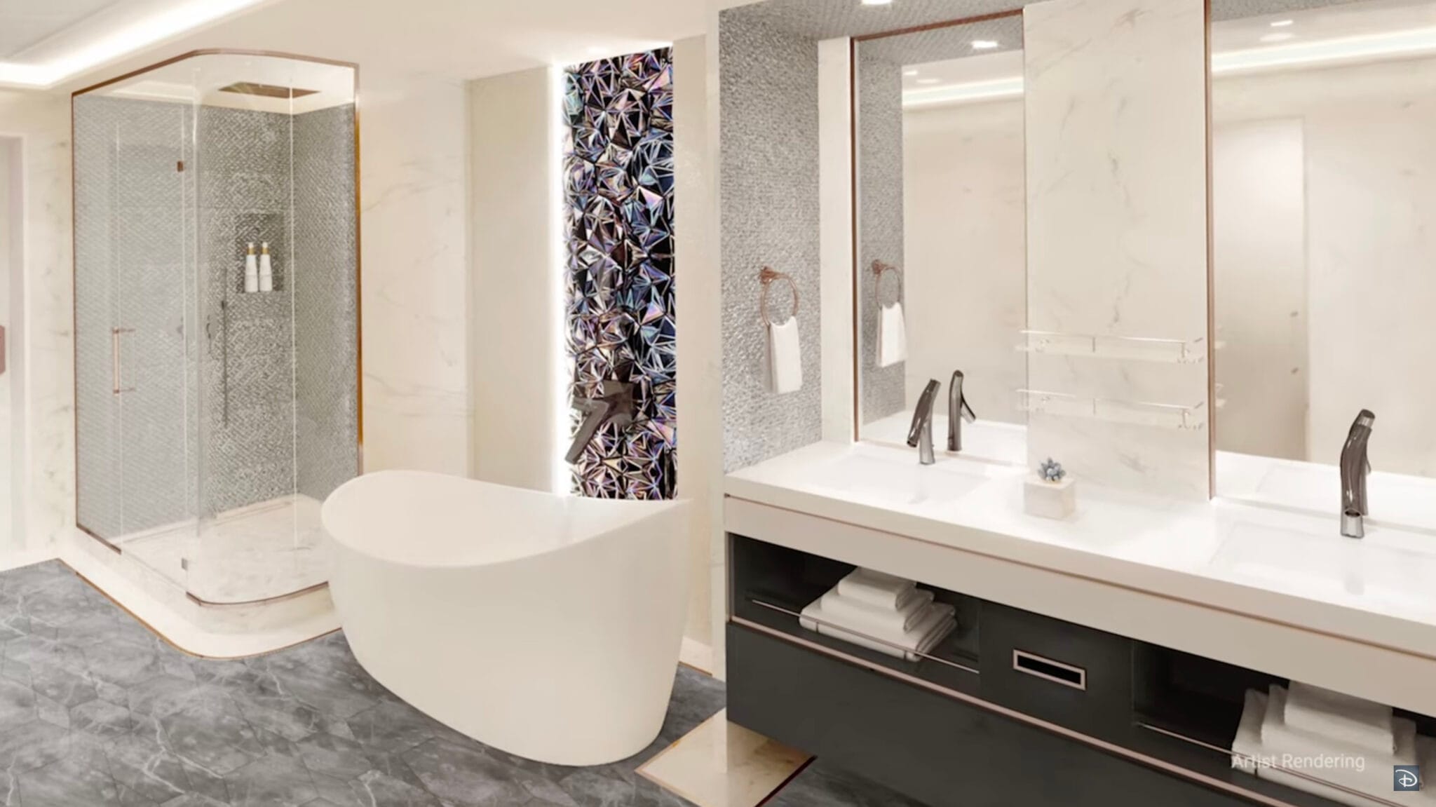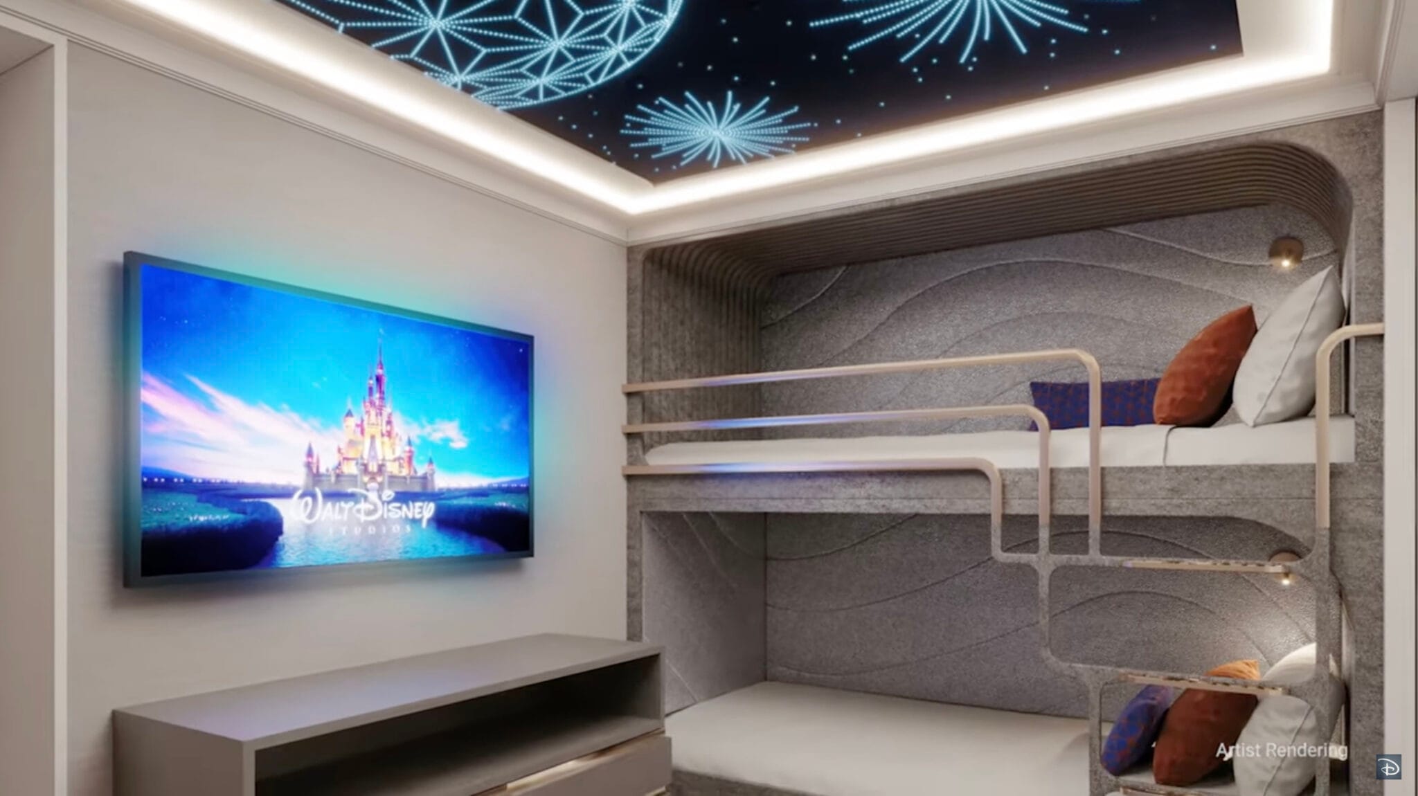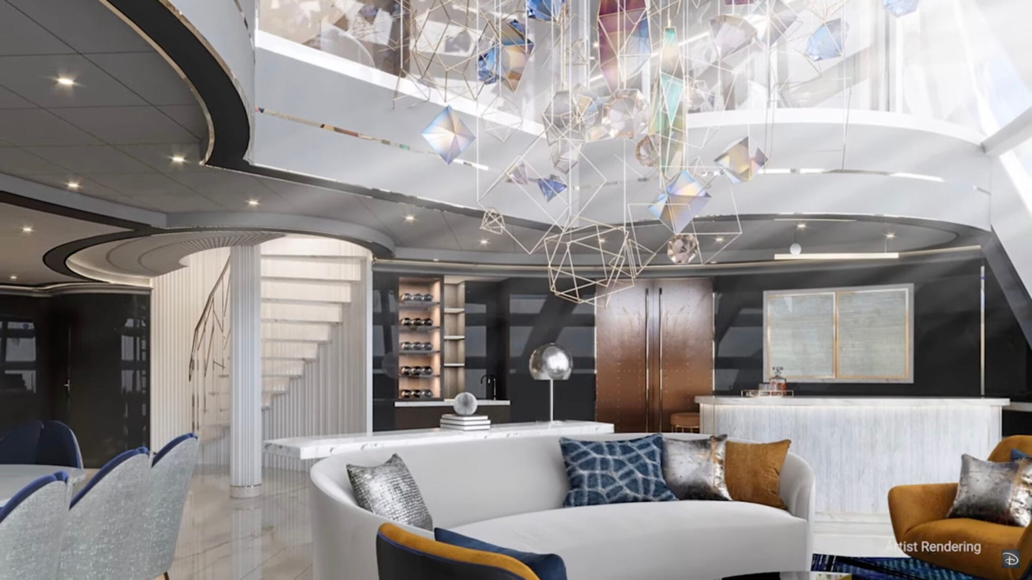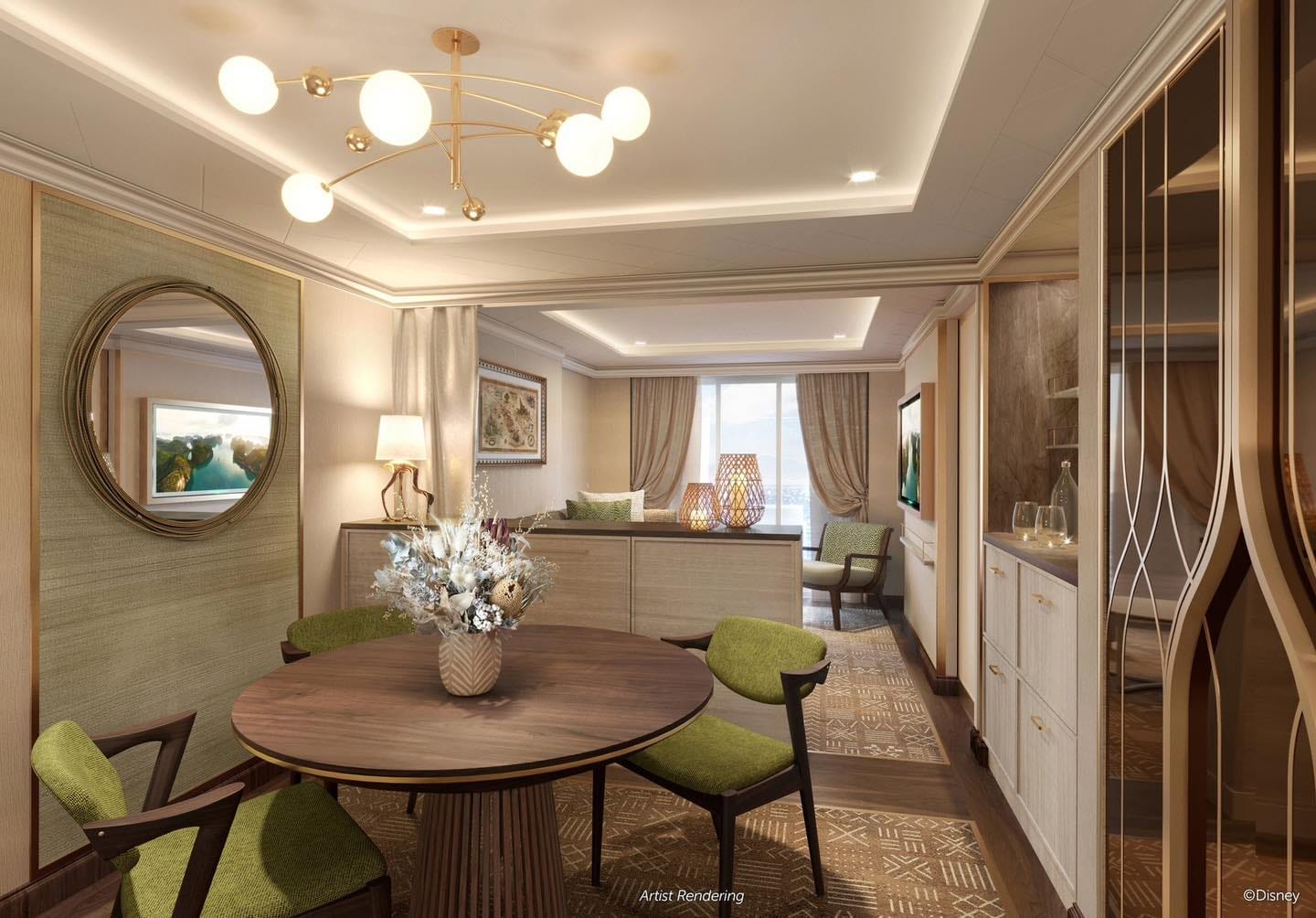 Embracing the adventures of the future, the Tomorrow Tower Suite will capture the same forward-thinking mindset that inspired the Walt Disney World Resort theme park, EPCOT, with an energetic design. Throughout the suite, dynamic art pieces, molten metal accents and futuristic, colorful glass accents will evoke the distinct atmosphere of EPCOT’s World Discovery neighborhood. Set high in the ship’s forward funnel, this one-of-a-kind suite will overlook the top deck of the Disney Treasure and glimpse the open horizon through an expansive two-story window. With nearly 2,000 square feet of living space, the Tomorrow Tower Suite will comfortably sleep eight guests and feature areas for eating, sleeping and playing, as well as other perks like a full kitchen and private ensuite elevator.