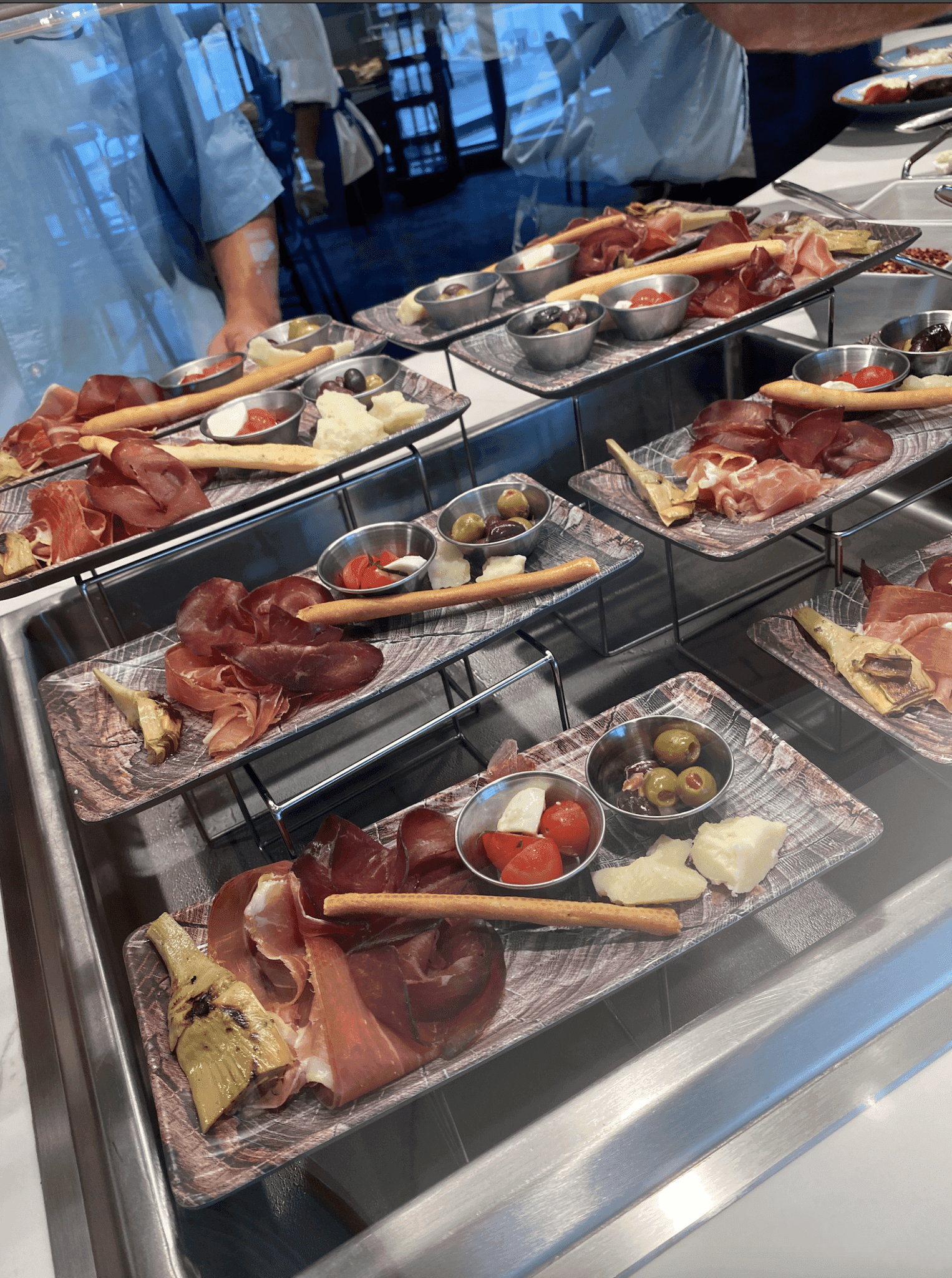 Marceline Market- Marceline Market is an up-scale “Cabanas” (if you have ever been on other Disney Cruises, you know what we mean) and the closest thing to a buffet-style restaurant found on the Disney Wish. For breakfast and lunch, guests can order freshly-made food at ten different stations. At dinner, the restaurant becomes table service.
