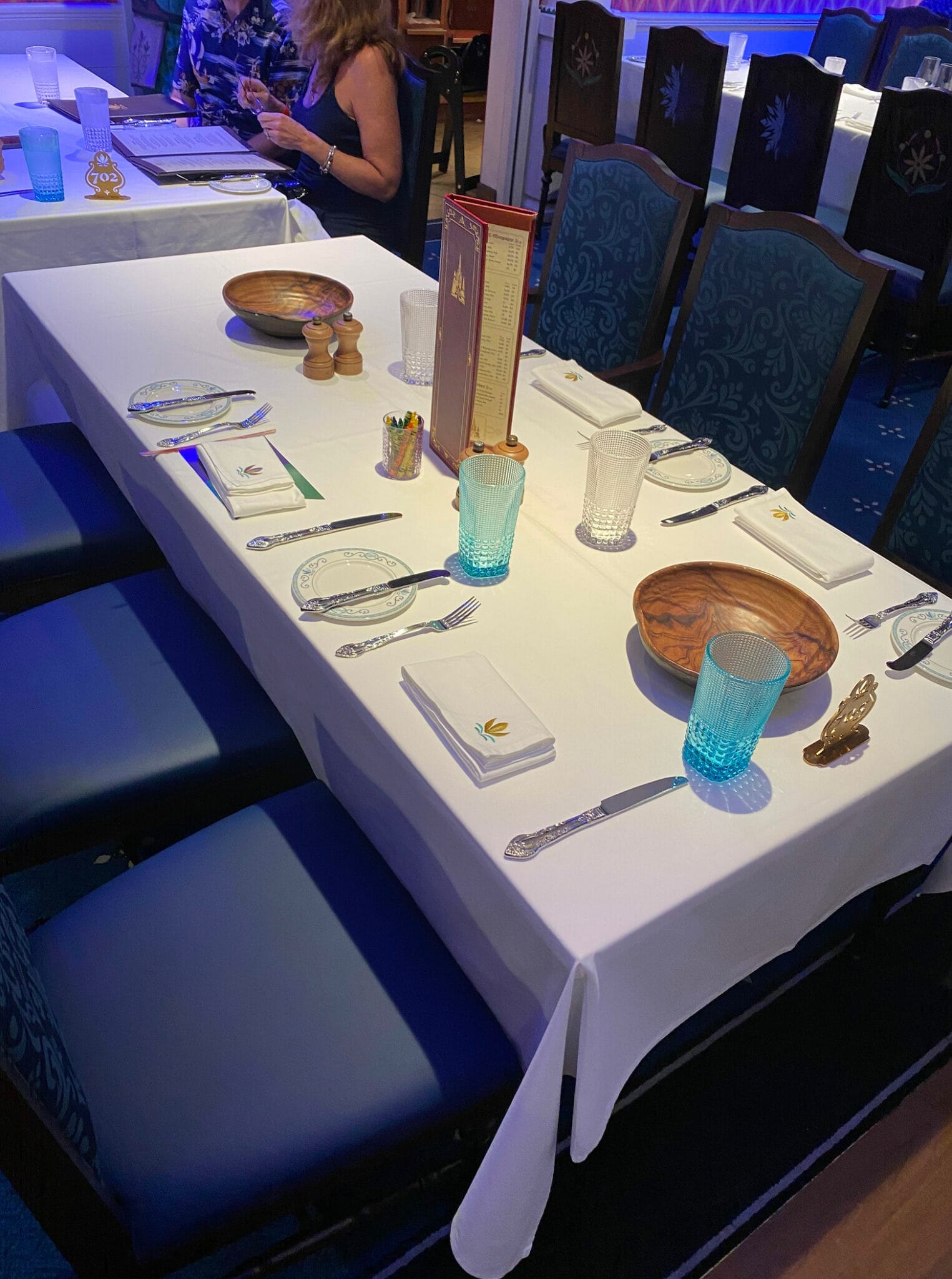 Upon arrival, you will receive your restaurant schedule and table number by checking your Disney Cruise Line Navigator App. Then, each evening, you, your tablemates, and your servers will rotate to a different restaurant. As you rotate, the same wait staff—who know your preferences—will serve you each night while you get to experience the unique atmosphere of each dining venue. Families with young children often choose the earlier mealtime, while adults or families with older children may opt for the later meal. You do not need to make reservations for any of the main dining rooms.